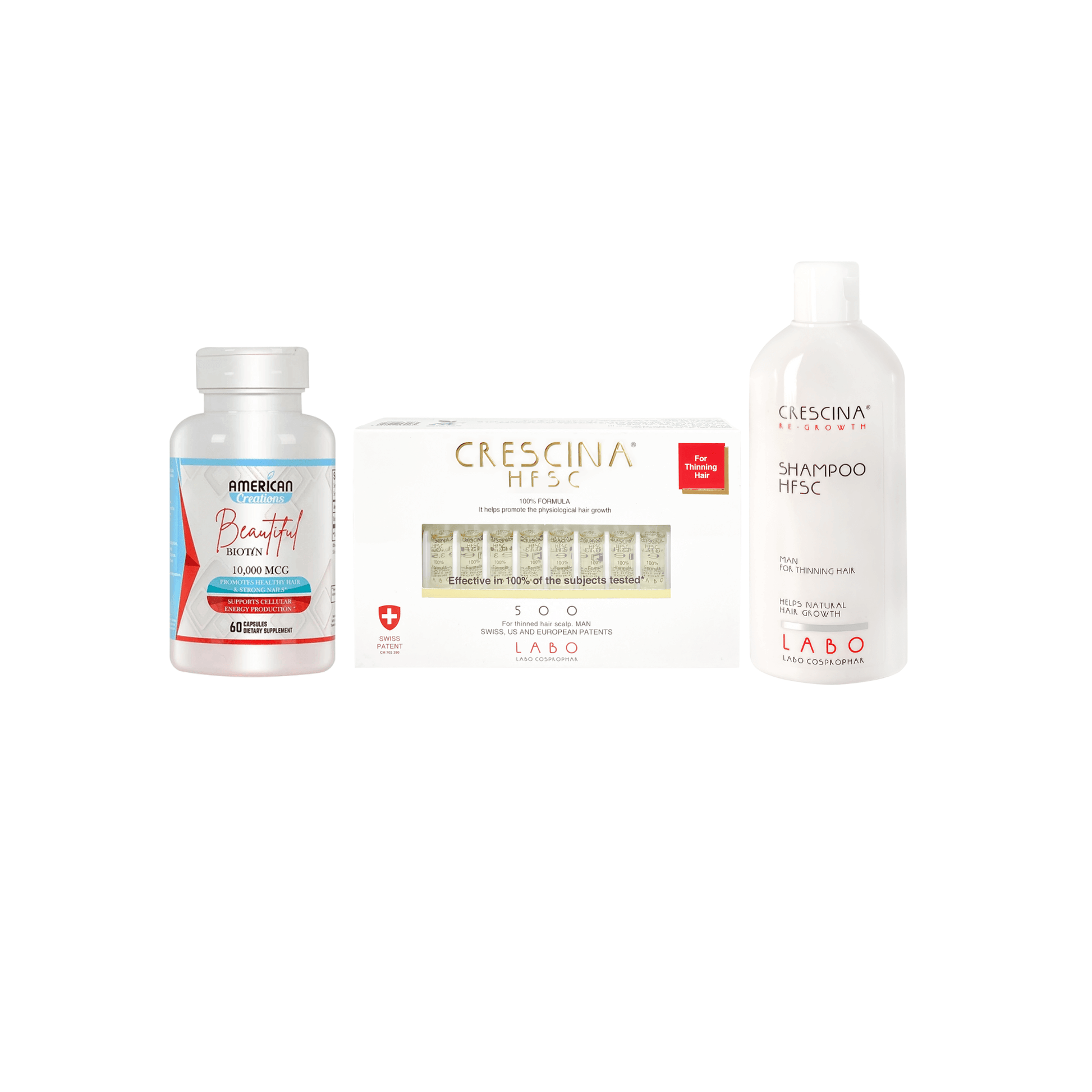 تم تصميم أمبولات Crescina 500 Man لتعزيز نمو الشعر لدى الرجال الذين يعانون من ترقق الشعر والصلع الوراثي. تتميز بصيغة سويسرية حاصلة على براءة اختراع تحتوي على مكونات فعالة مثل السيستين، الليسين، الجليكوبروتين، إلى جانب مركب HFSC (Stem-Engine)، الذي يحفز بصيلات الشعر ويدعم دورة نمو الشعر الطبيعية. باستخدام تقنية Transdermic، تضمن هذه الأمبولات اختراقًا عميقًا للمكونات الفعالة في فروة الرأس. الاستخدام الموصى به هو قنينة واحدة كل يومين لمدة 4 أسابيع.